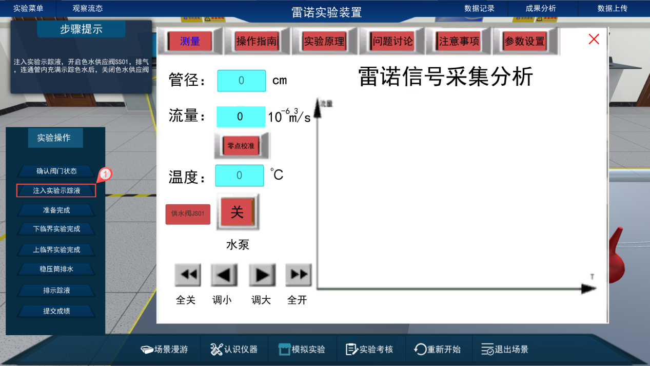 場景中會出現(xiàn)序號以及步驟提示,學(xué)生可以根據(jù)這些提示的引導(dǎo),完成雷諾實(shí)驗(yàn)。